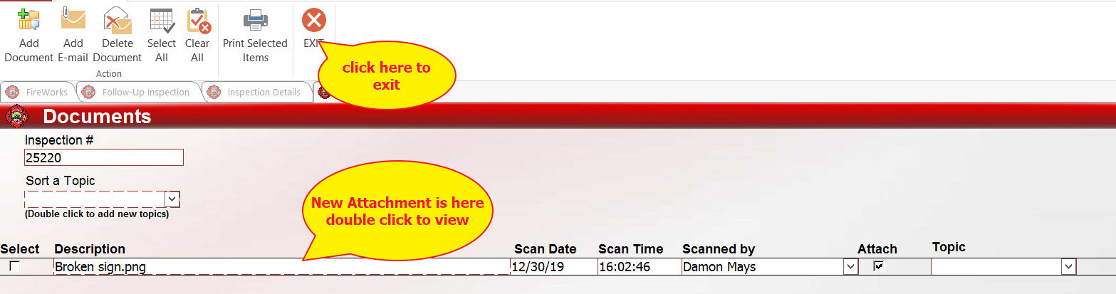 Inspection module--->Follow-up Inspections Double-click the inspection number Click on the camera icon Select Add Document Select the document to attach If theres a document the info will be displayed below on the page Select exit to go back to ...