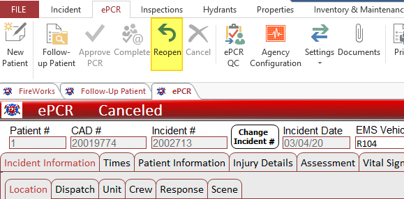 Within the ePCR, click on the ePCR-> Reopen menu item, to reopen the patient report.