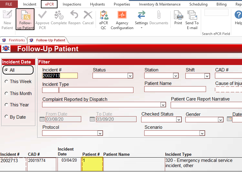 For viewing and reopening in the admin desktop program: Click in the menu on ePCR-> Follow-Up Patient, and search for the incident. In the results double-click on the desired patient number, to open the ePCR.