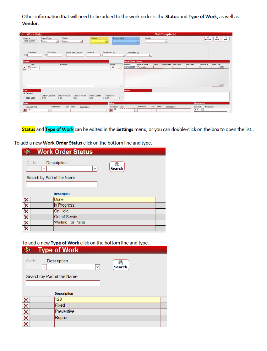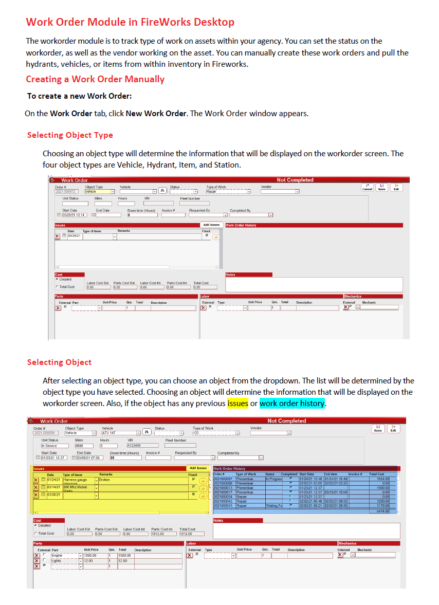 Work Orders Work orders help track repairs, maintenance tasks, and associated costs for vehicles, stations, and equipment. The FireWorks system provides comprehensive work order management from creation through completion and cost tracking. If this ...