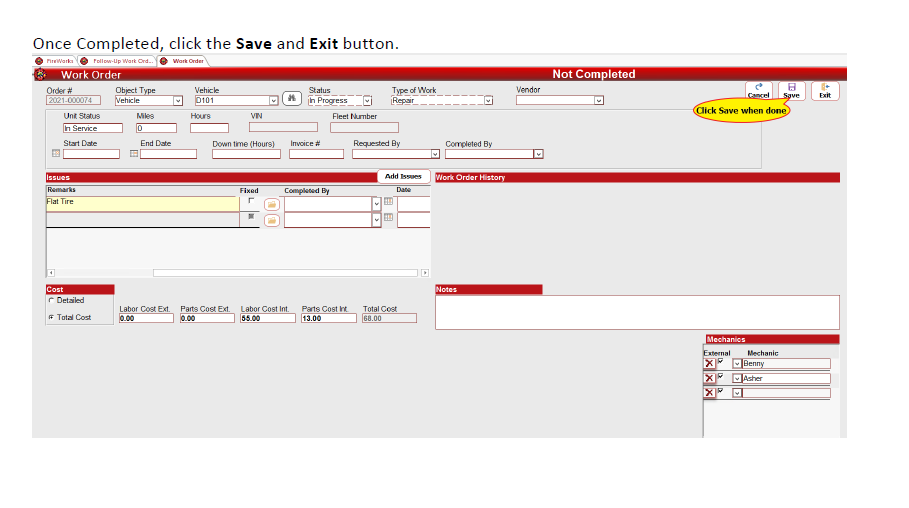 Overview Work orders help track repairs, maintenance tasks, and associated vehicle, station, and equipment costs. This guide covers creating work orders and setting up basic information. Check Prerequisites Before creating a work order, verify the ...